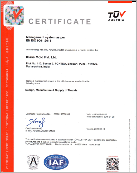 • Klass Mold is a private limited company incorporated in 2014 , which is ISO 9001:2015 certified from TUV Austria.